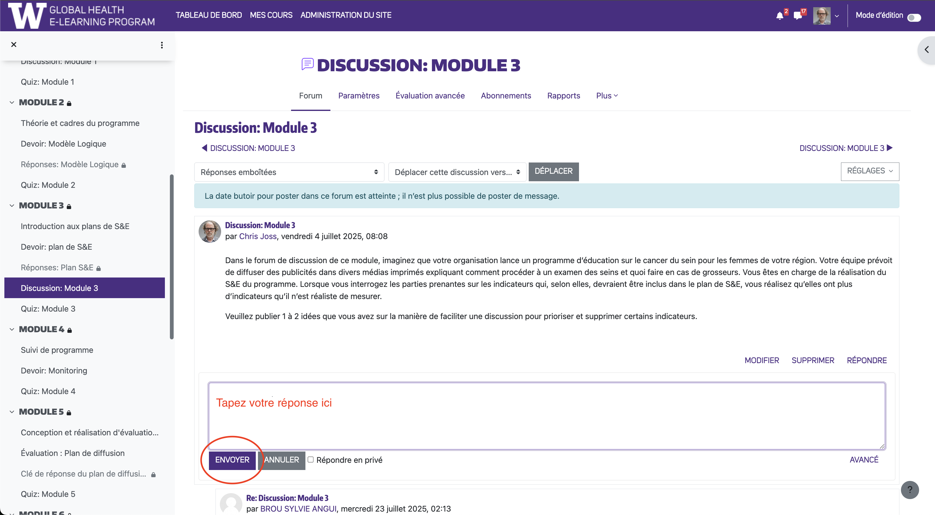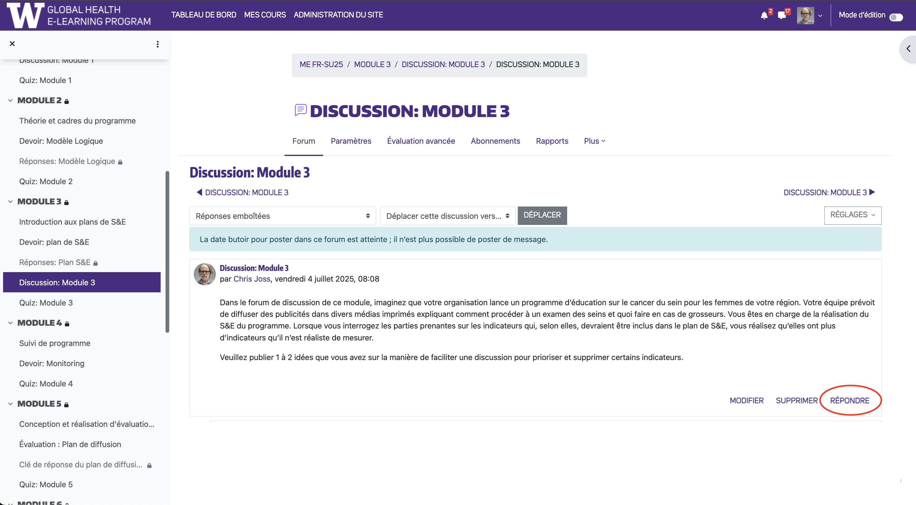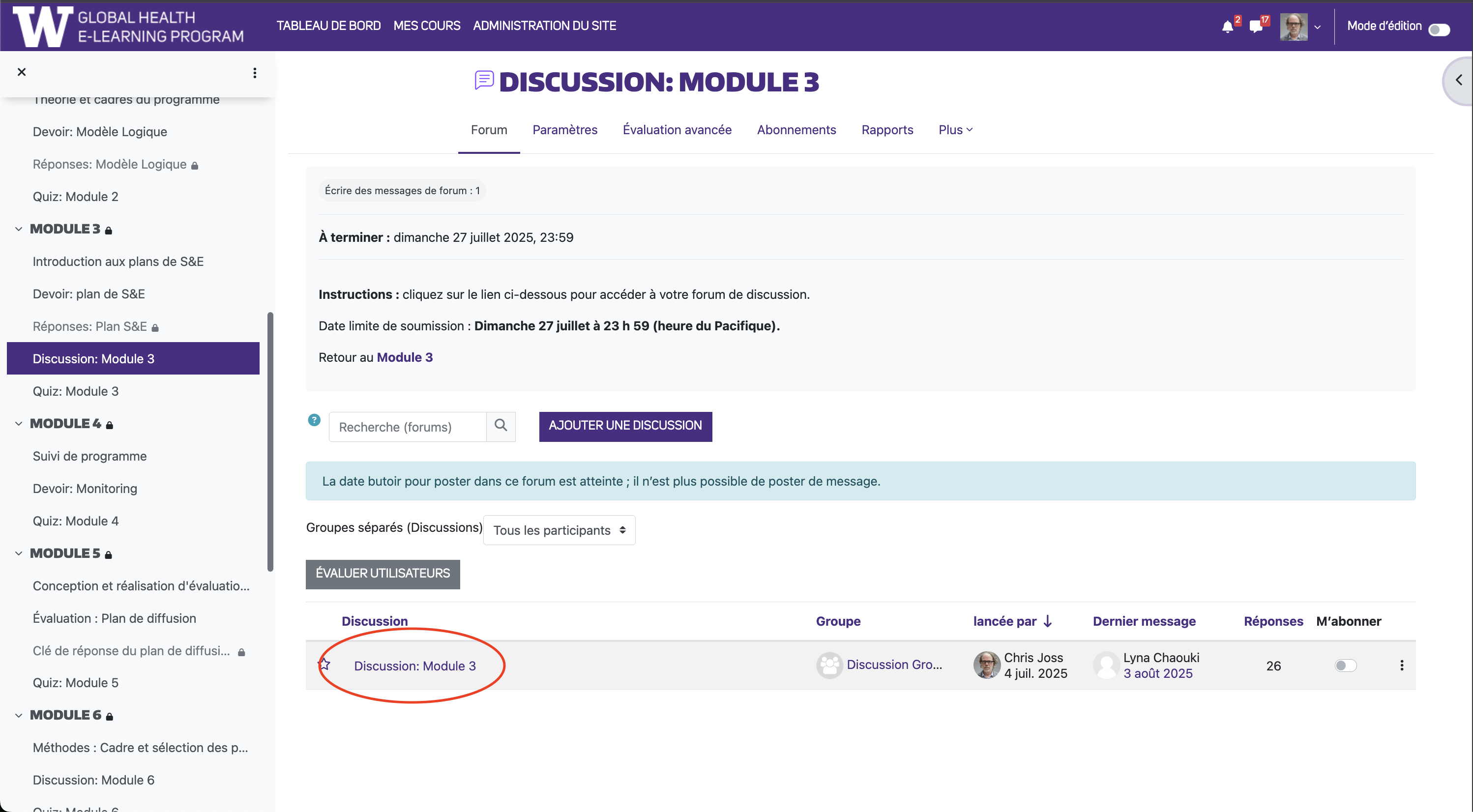 Étape 1 : Localisez la discussion à laquelle vous souhaitez participer dans le menu de navigation de gauche et cliquez dessus. La page de tâche de discussion apparaîtra dans la fenêtre principale. Faites défiler la page jusqu'en bas pour voir un lien en surbrillance avec le nom de la discussion et le module associé. Cliquez sur ce lien.