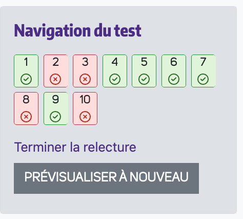 Lorsque vous révisez et êtes prêt à soumettre votre quiz, le bloc de navigation du quiz vous indiquera ce qui suit :