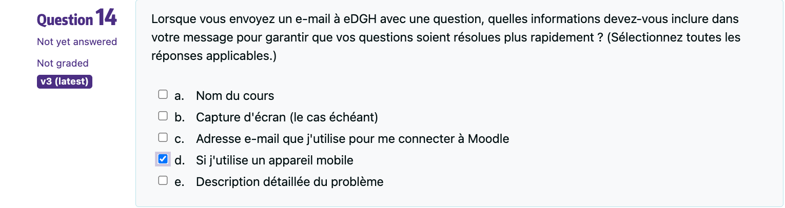 ! Si votre quiz est interrompu, vous pouvez revenir au quiz et cliquer sur Reprendre la dernière tentative pour reprendre votre travail, même si vous perdez votre connexion à Moodle, tant que la date limite du quiz n'est pas dépassée.