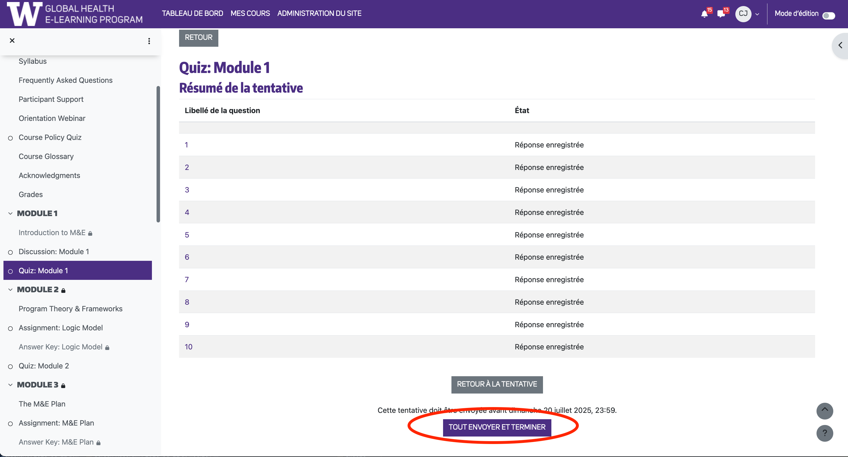 Vous serez redirigé vers votre quiz soumis et pourrez consulter les détails de votre soumission. En haut de votre quiz, vous verrez la date de votre soumission, le temps écoulé, vos notes et votre note finale. Lorsque vous avez terminé de consulter votre soumission, vous pouvez cliquer sur le bouton Terminer la révision pour revenir à la page principale du quiz.