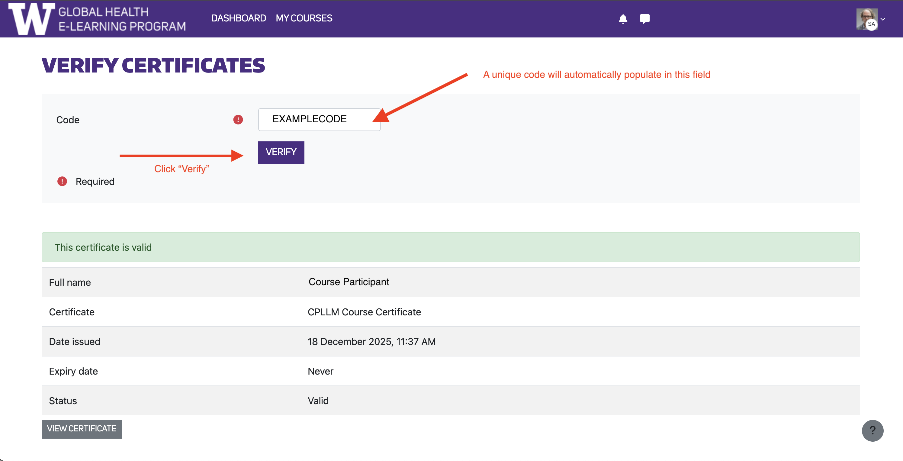 Certificates issued for those who have successfully completed the course will show as “valid.”