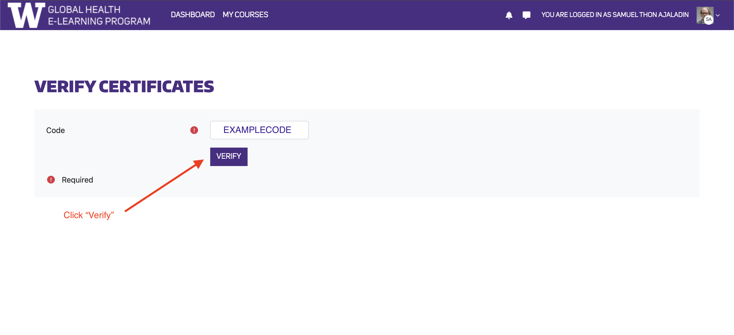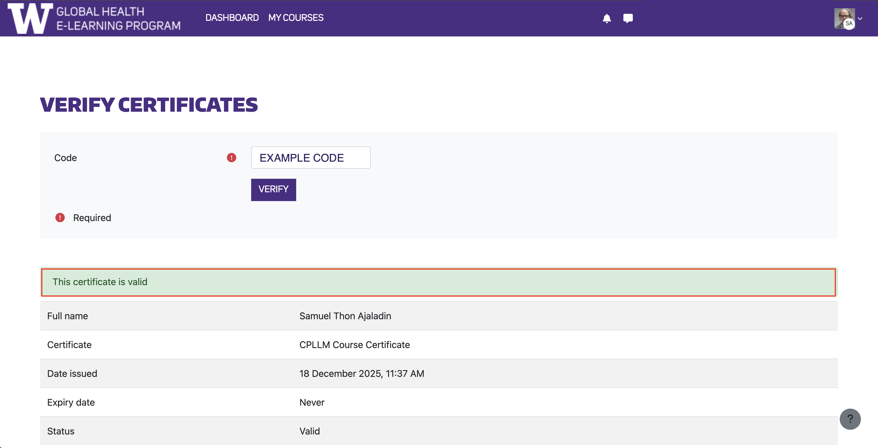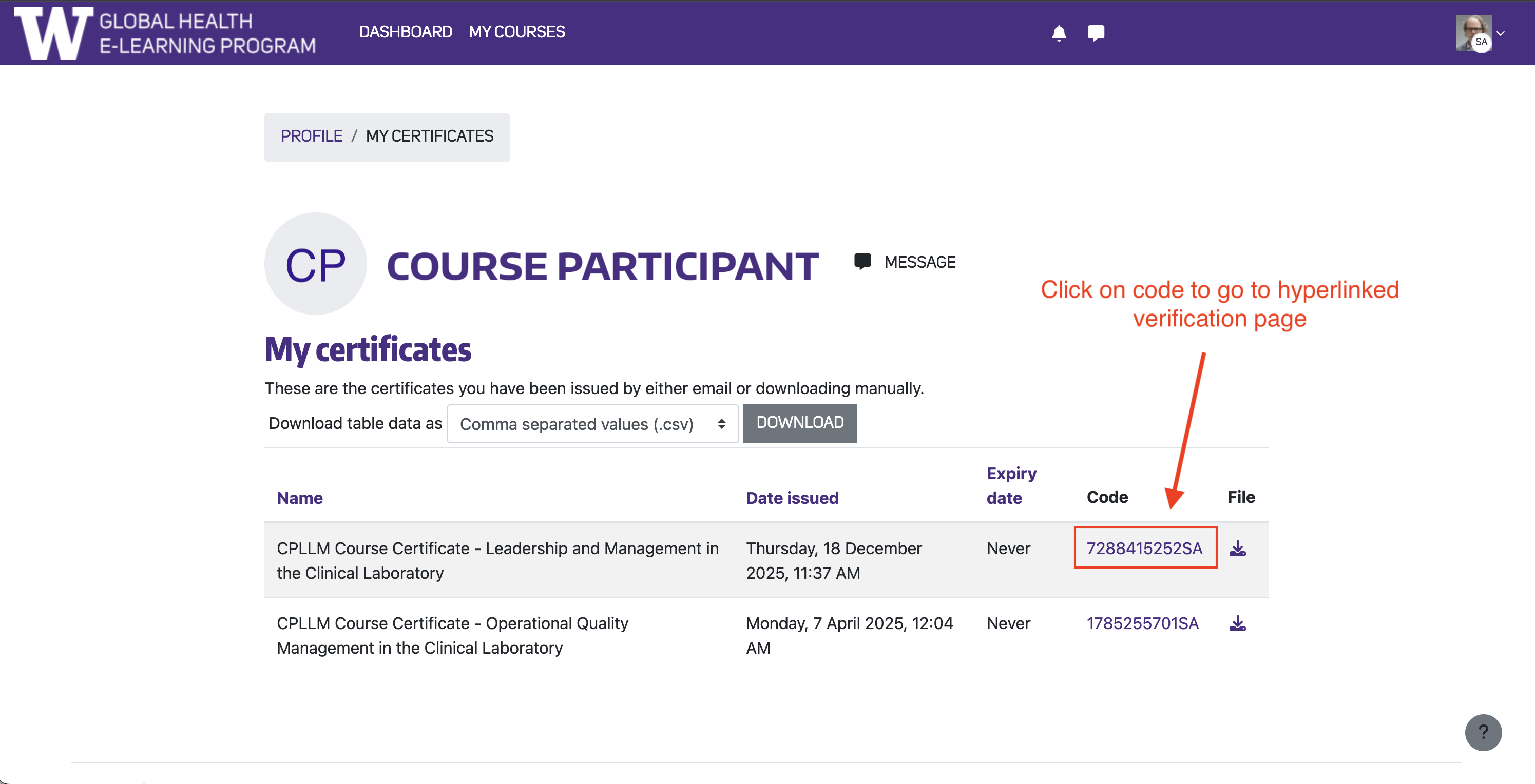 On this page, you’ll find a listing of any course certificates issued digitally, including a unique alphanumeric code associated with your certificate. Click on the code for the listed certificate to go to the hyperlinked verification page.