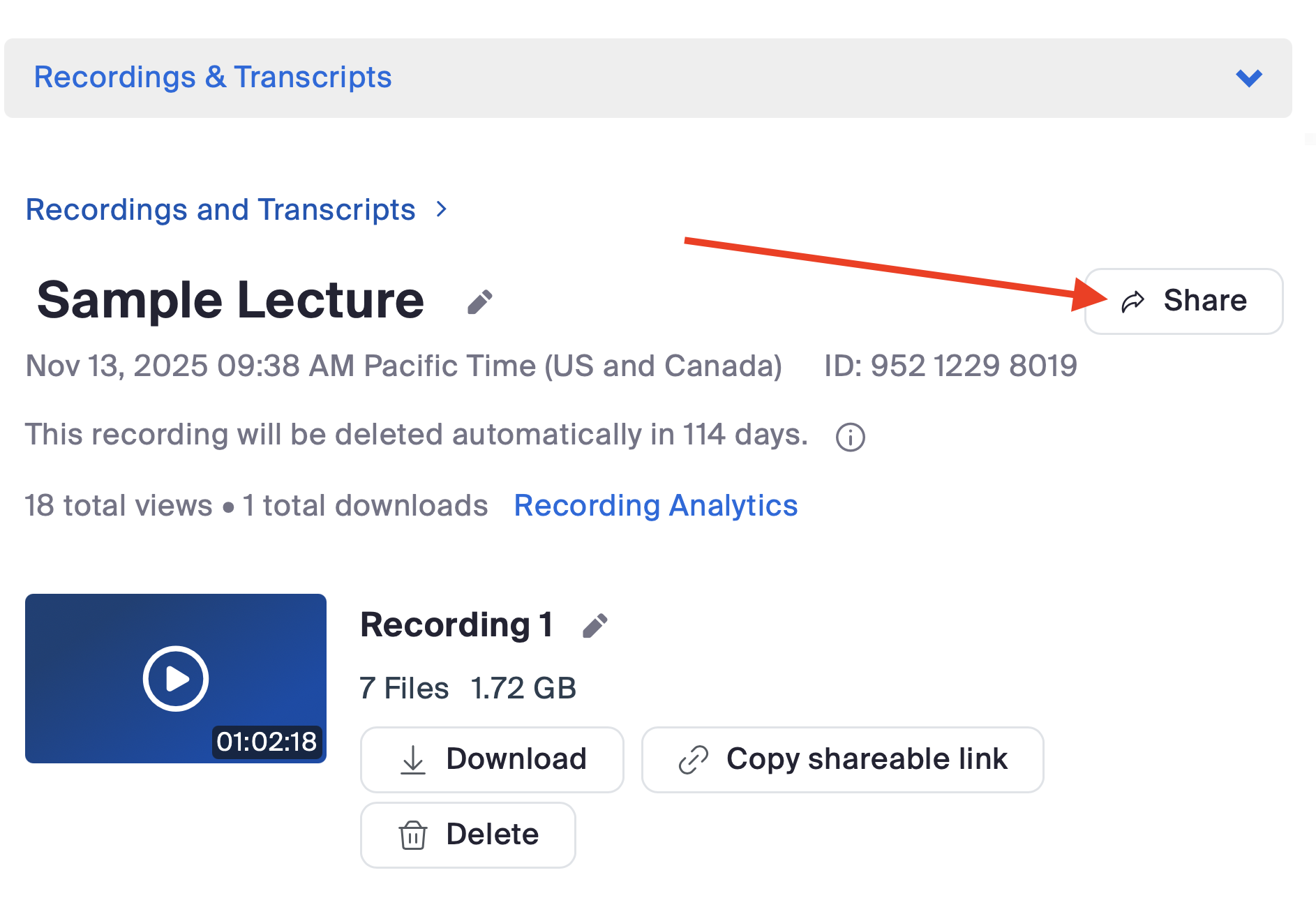 - Click the recording title, then click "Share".
