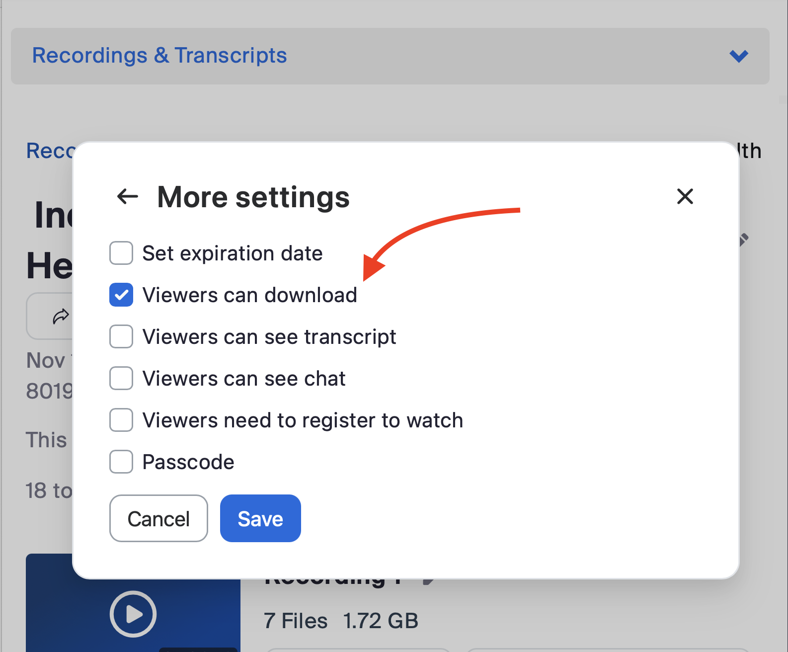 Next, locate the recording, set permissions for downloading and share the link