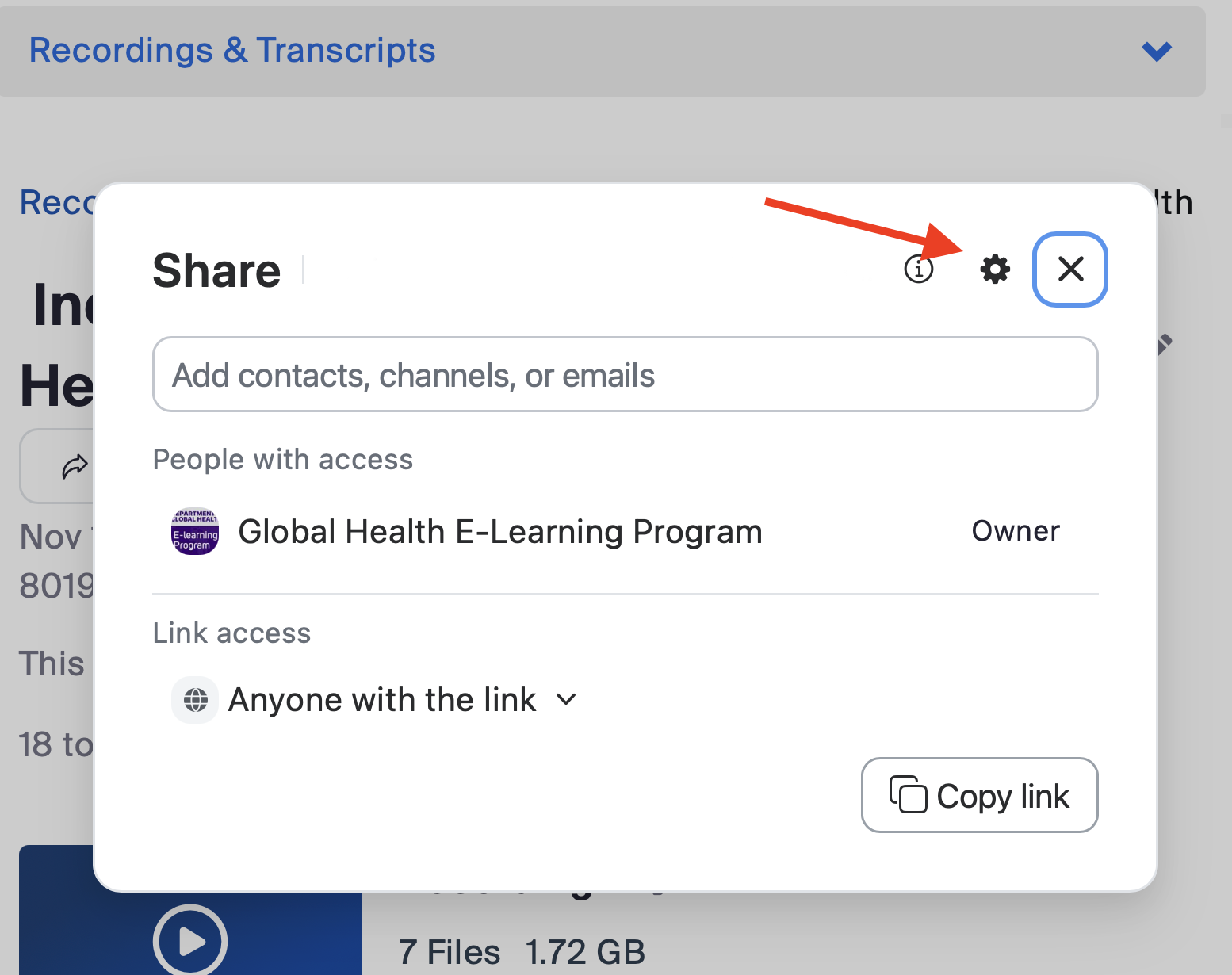 5. From the pop-up, open the recording share settings by clicking on the gear icon