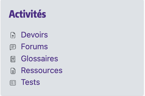 Étape 1: Les évaluations peuvent être trouvés à 3 endroits. Elles sont situées dans chaque page de module de contenu, sous l'en-tête du module dans la navigation à gauche, ou vous pouvez les trouver dans le bloc Activités sur le côté droit de la page du cours Moodle.
